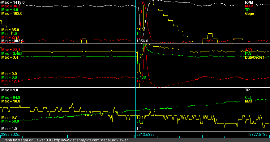 So, it started and idled ok untill the MTX-L htr went off and got a reading, it was about 15 AFR for a few secs then revs dropped and AFR went to 19 before it just about died and looked like to ECU sent loads of fuel to keep it running. cycles like this every 5-6 secs.