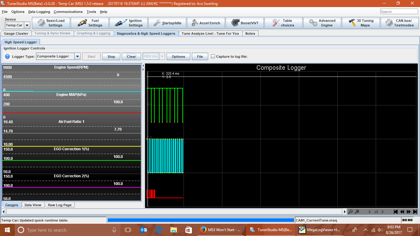 I'd sure appreciate some help with a sudden no-start situation. I started my car for my weekly trip to Cars & Coffee but the engine died after a few seconds. The engine cranked when I tried restarting but nothing else happened. I'm seeing AFRs of 22.4 after cranking, which lead me to wonder if there's a fuel issue. I put the MS into test mode and verified I could hear both the ignition system and injectors firing. I also put the fuel pump into test mode and it sounded like fuel was flowing. I see a signal from the CAS so it seems that should be OK. The main relay appears OK because I'm still able to communicate with the Megasquirt. I swapped it out for another one just to be sure but had the same problem.
