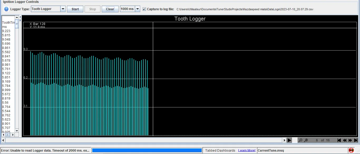 As of now, the megasquirt is not reading crank signal. When trying to start, It feels like no fuel is being injected. I Did multiple start attempt with varying turns for trim pot r56. I tried to set it to 7 1/2 turns as the assembly said but it didn't do it. Someone told me to do a composite log and tooth log. The tooth log was completely empty. I'll join a picture of the composite log. I checked continuity on pin 24 (Crank in) for the sensor to the MS. I'm using the firmware and basetune for the MSM on trubokitty.com.