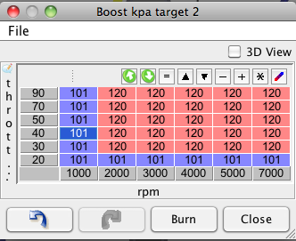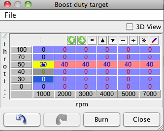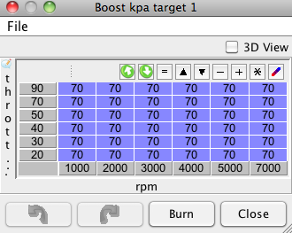 I have no tps, so I set the boost target kpa's as recommended in the megamanual to 70pka for everything, and I started to work on the boost duty cycle target table (which i believe is what actually controls the solenoid)