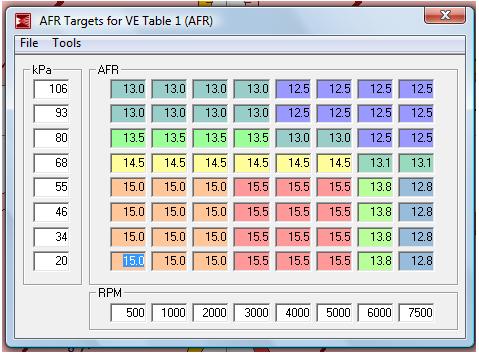 I've been pondering about this since I was never a 100% happy with the way my AFR targets are setup in MegaTune. I scaled all the tables down to mapvalues used in a non-forced induction motor, but I feel there's more