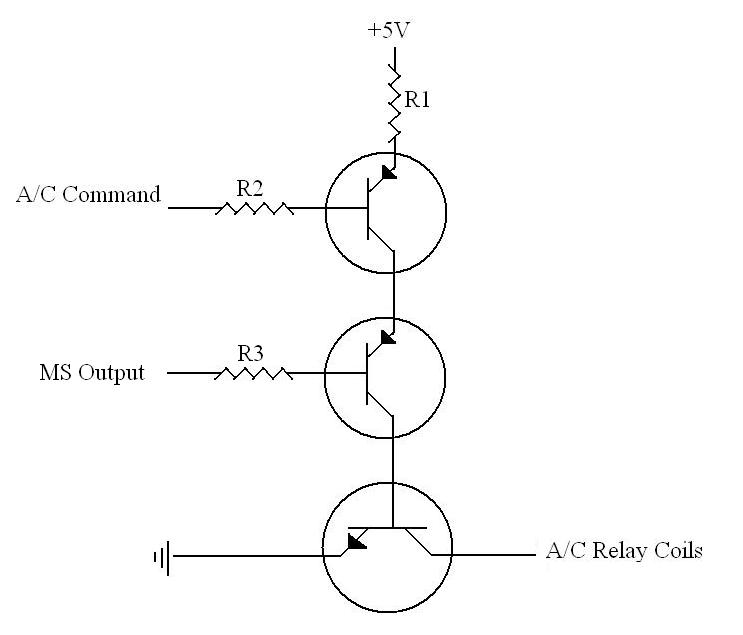 A/C activation isn't handled in any way by the megasquirt. There might be a neat little circuit in the MS' case, but that's due to a matter of convenience. All you need do is translate the high resistance ground provided when the a/c command button is activated into a low resistance ground to trip the a/c comp clutch and cooling fan relays. This can be accomplished with 2 diodes and 2 resistors.