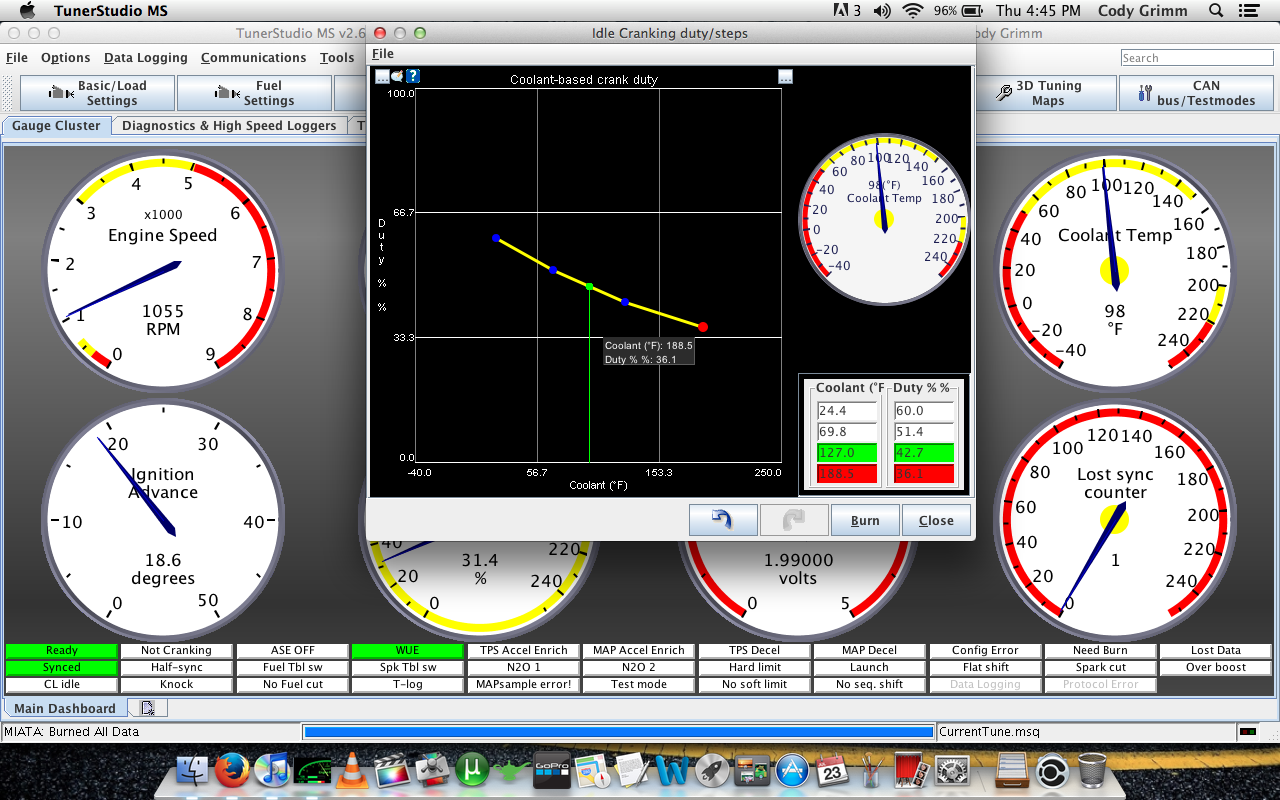 1999 Miata, t2 turbo setup, MSPNP2. Ever since I installed the turbo setup, I've been having issues getting the car to start. Mostly on cold starts but also on restarts/hot starts. It will crank but I have to give it some throttle to get it to turn over. Once it starts, the idle will fluctuate a bit, I'll still have to give it some slight throttle & then about 5 seconds later it will idle perfect. I've got the car running fairly well now with solid AFR's. It's just the starting I'm having some trouble with. The only thing I've adjusted is the cranking RPM. I've posted some screenshots of several graphs as far as startup. These have not been adjusted. I'm still getting the hang of TS so bare with me.