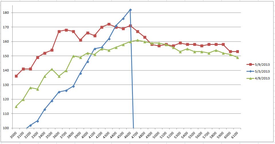 There are several third and fourth gear pulls around 1083 seconds. These maxed out around 171 and fell to 160 in higher rpms.