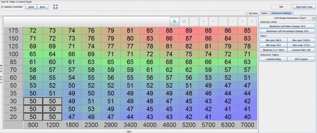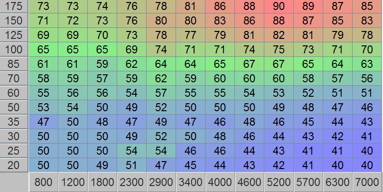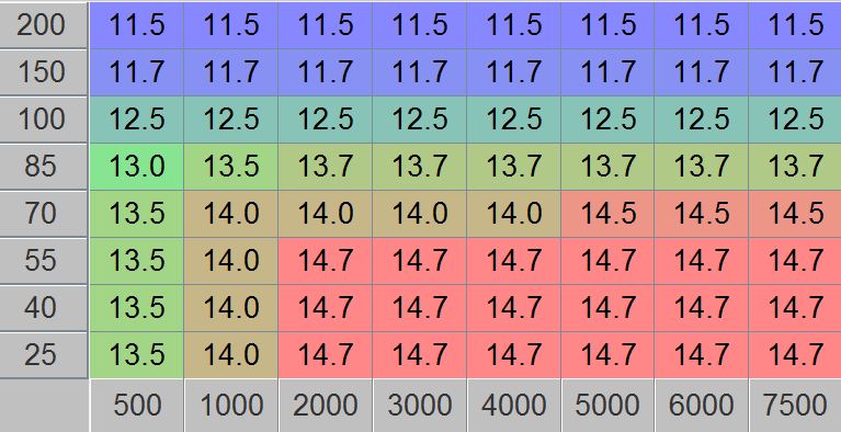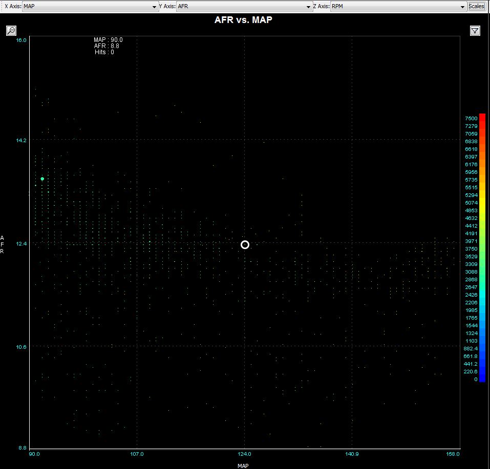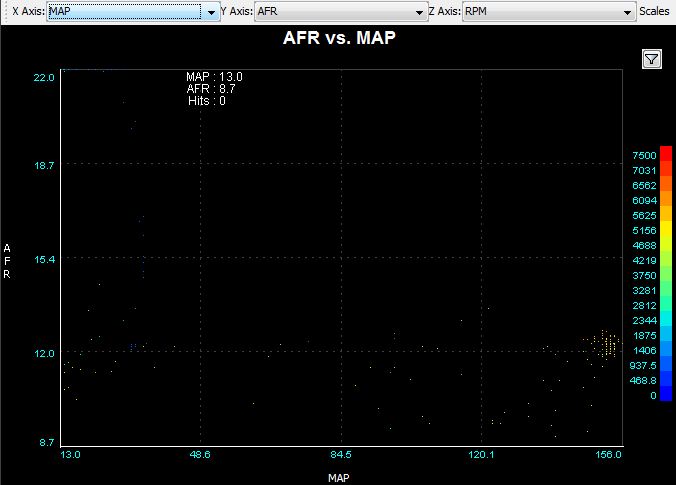 Between 100-125 kpa, most of the points are between 11.7 -13.2 AFR. Above 125kpa most are between 12.5-11.3 AFR. There are occasional single points that are higher, but I just took those to be random occurrences that are probably acceptable.