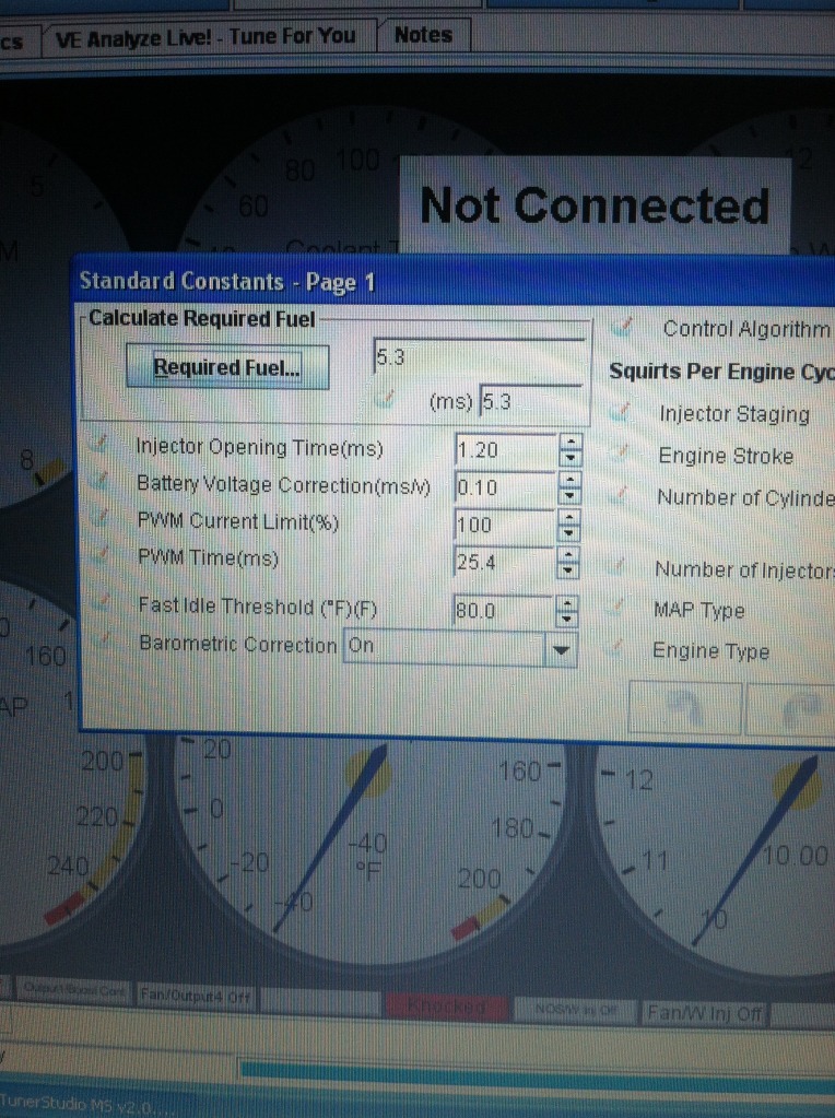 I adjusted the required fuel based on installing the 725cc ID injectors to be 5.3 based on what it calculated with me using 12.7 as a target AFR (wanted to start off pretty rich). Here are the settings: