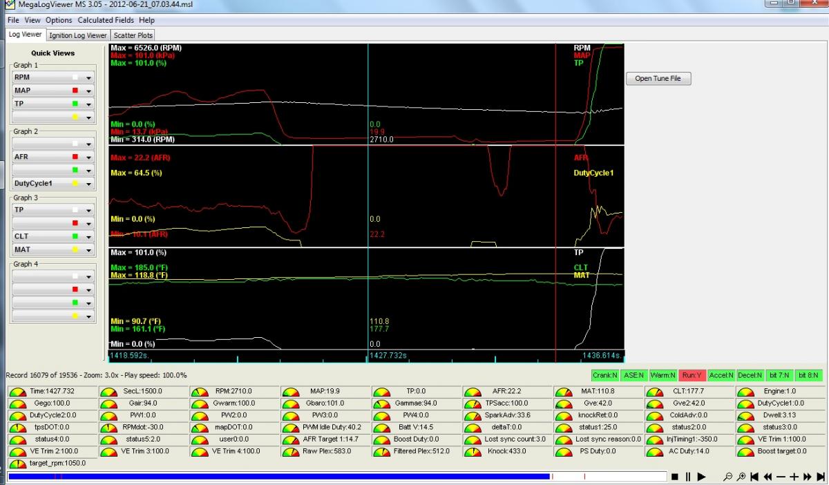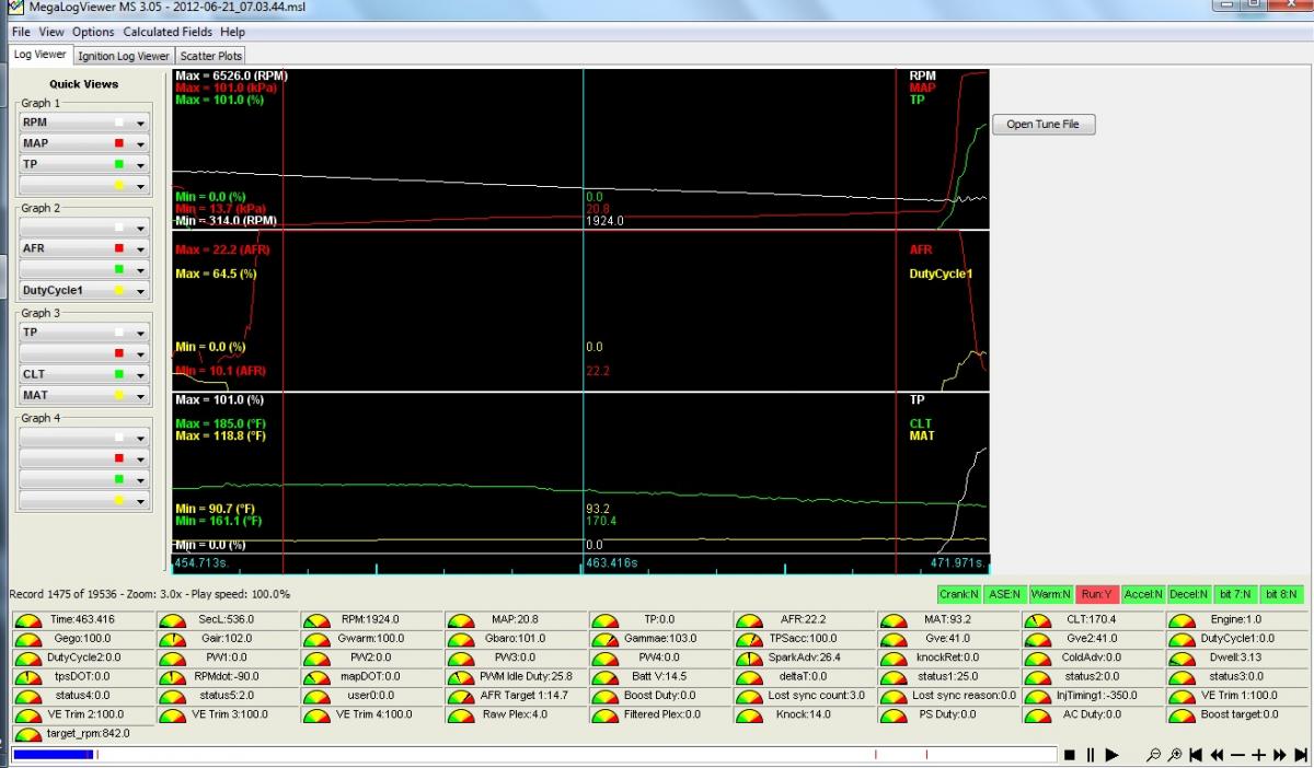 The first two markers (earlier on in the log) kind of bracket one of the examples. Looking at the first one, the rpms went from 2563 to about 1500 over 15 seconds. That's a drop of 66 rpms/sec for those keeping score at home. The third marker identified the end of one of the examples. That time the rpms went from 2912 to 2324 over about 10 seconds. That's a drop of 58 rpms/sec. Am I being too critical?