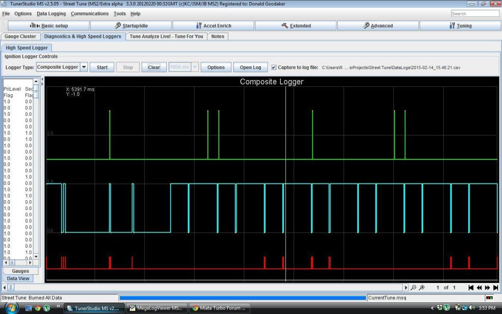 I went back over the wiring for the cam sensor and I know the ground wire and the power wire are working. I have not been able to figure out how to test the signal wire connections yet but Sixshooter is coming over with his multimeter now. I also respaced the crank sensor because it was bothering me. I have attached a composite log to show what I am seeing. It definitely does not look right to me but I am at a complete loss.