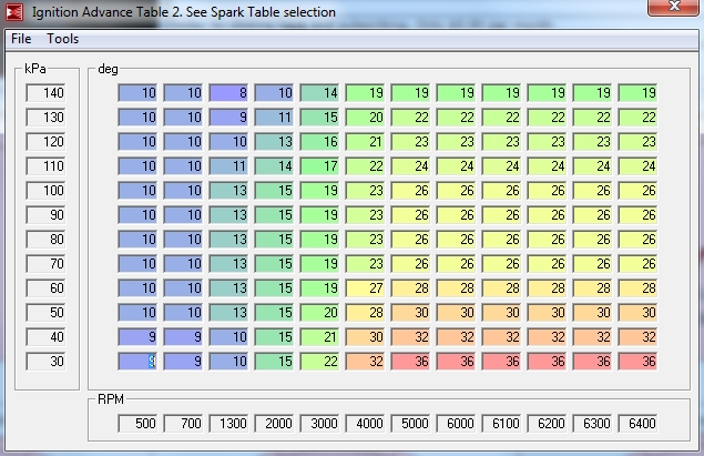 Idk why the last spark table only goes to 6400 rpm and has funky rpm intervals though.. where did you get it? It looks like it's for a supercharged v8.