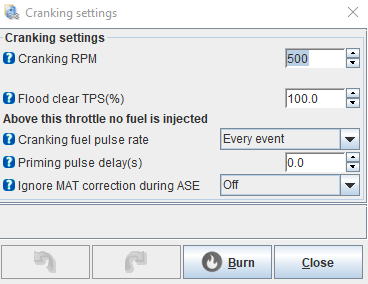 And set flood clear to 70, confirm that the TPS measures from 0-100 in TS. Try flooring it during cranking after the first couple of revolutions and see if you notice a change.