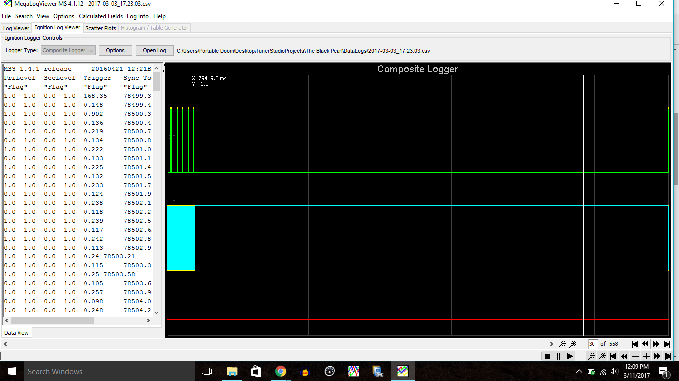 I think I just realized I can look at .csv in megalog viewer haha. Looking at page 30 it looks like the sensors just cut out for a tic and resume like all is okay after. Can someone school me on reading logs? I've only been looking at the live feed and screen captures until now. Can I somehow take all that .csv file, jam it into excel, and graph it to look for a squigly graph with a sudden drop to zero to find issue spots. I'm still a bit lost. Every time I swear I have a handle on this new issues come up.