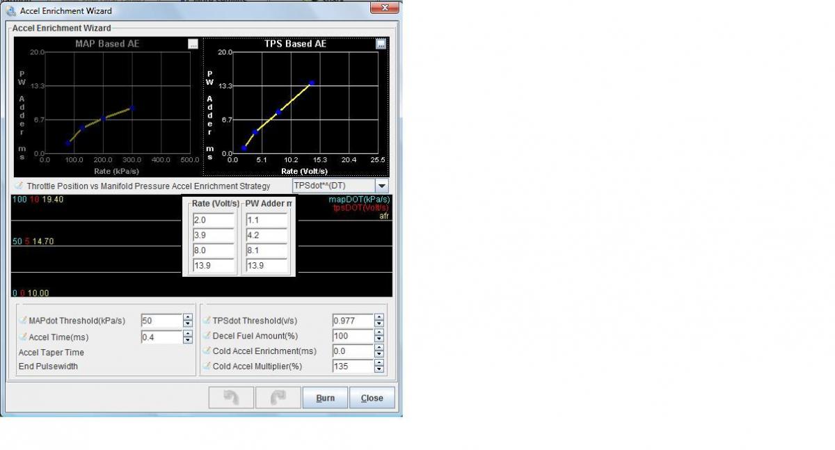 I can't get it to tip in early enough With MAPdot. It seemed easier to get the TPSdot set too. It's pretty close. 13.5 AFR under accel for the most part and no bucking even with the light weight flywheel.