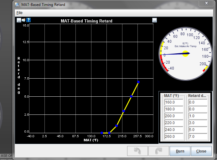 Ok, so what is everyone running for MAT based timing retard? Please post what fuel you're running. We know you guys with E85 probably don't even have a table, but the rest of us on pump gas need this feature.
