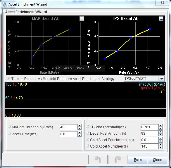 I was unaware that the accel enrich table traces your last throttle jab. Now I understand what Brain meant by "watch the green dot". So, it is very easy to see what part of the graph needs to be adjusted while you are driving. No need to datalog, just tune for feel.