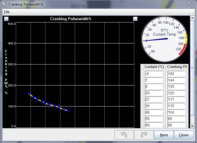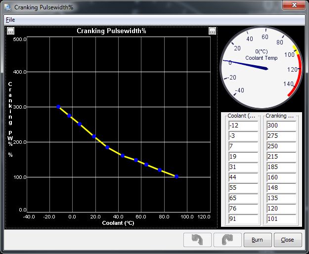 Next day, increase the values in the cranking pulse table by 10% and datalog the start. If it gets better (again, measure like above), add another 5%. Repeat until you are comfortable with the result.