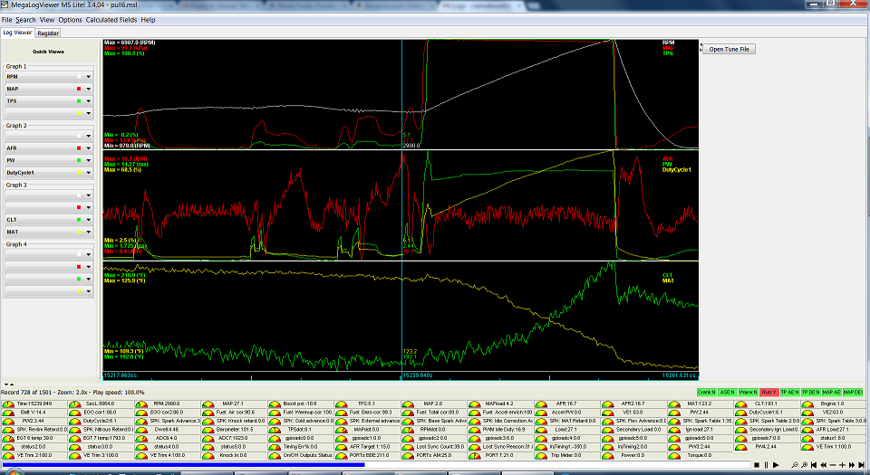 When I do a WOT pull, I watch the gauge and see it is around 12.8-13 (good). This appears to be in sync with what TS is showing on the dial, but when I bring it up in log viewer, the points logged in the logfile do not show what I saw on the gauge, during pull, they are .5 or more lower (In the pic, the gauge was reading 12.7-12.8 on wot pull, but log is showing lower on average.)