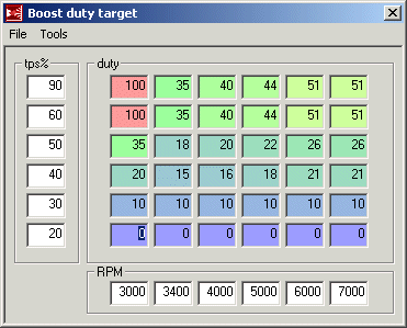 3rd row down is 50% TPS. I do 50% of the above rows. So it i am calling for 40% duty at 4000rpm/60% TPS I call for 20% DC at 4000rpm/50%TPS