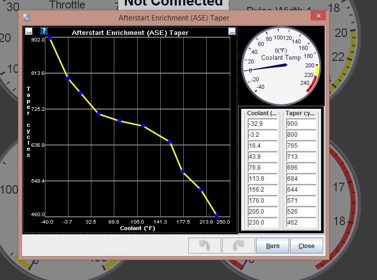Mazduh: ASE is set at the crank temp and then is timed out (by tenths of seconds or by cycles as set elsewhere). The X-axis is the temp at start only. WUE works like you are thinking.