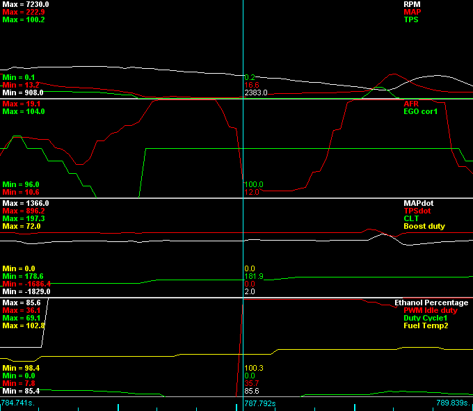 Here's a pretty good throttle drop from yesterday... the last one shown (no special actions on my part, this is my tune): Note that it only went 10.3 rich and 16 lean. But most importantly, it goes right on back to proper almost immediately (less than a second).