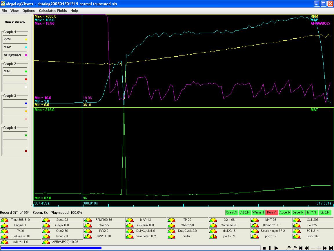 Thanks for posting that (I just noted the Compare feature). I was going to note that at the end of the "lean" log I am seeing AFR's of around 17 where on the "normal" run it was about 12 (this at about 170kpa). Increasing monotonically with MAT and RPM's (where on the "normal" log the AFR seems to stay relatively flat.