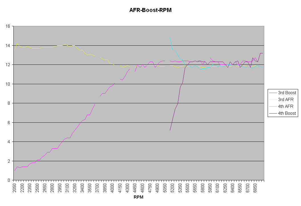 Ok I've gone over another log from the other night. Don't be too alarmed by the 2nd gear low RPM AFR. There is a delay with my AFR due to the UEGO being next to the tranmission. VE Live also added a few points of fuel in those areas, so it should be better. I have lowered my AFR table some at the 137 Kpa area to bring down the AFR's to 12.2 in that area to help the transition into boost be a little richer. May richen my 12 PSI area just a bit as it interpolates in that area. Can't wait to get my det cans.