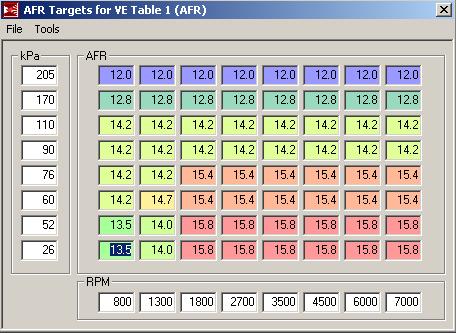 I have made a ve table that ive scaled for off boost resolution and only am using the top 3 KPA bins for boost. They are in roughly 30 - 40kpa increments. Note that I am not actually boosted so dont bug me about the VE in boost, I already know. Also I have not tuned it at all yet, just scaled it the best I could based on my MSPNP scaled map that I had roughly tuned. I also attatched my AFR target table.