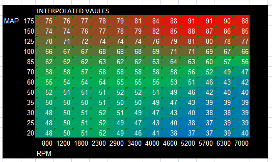 The new values are calculated in the "INTERPOLATED VALUES" section. Copy these new values back to your tune. Make adjustments were necessary. Like in your idle region, for example, if you want to keep that area using the same value in each cell.