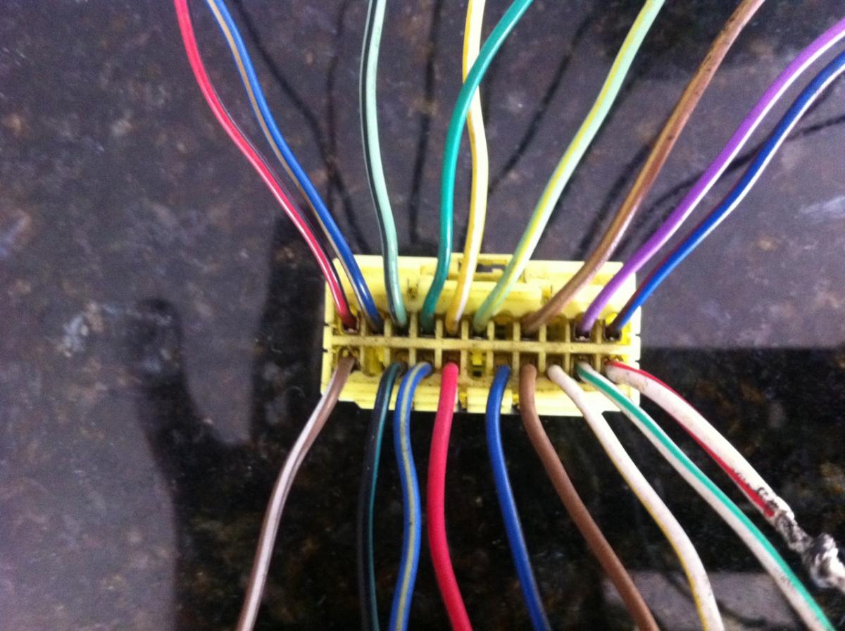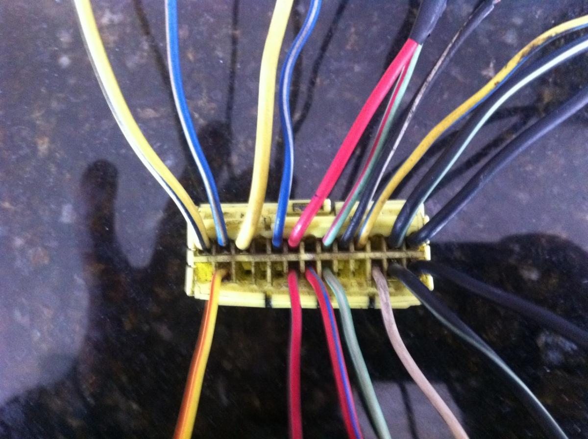 wires at the top as in pic, red/black , blue,yellow, light green/black ,green, yellow/white, light green/yellow, space ,brown /yellow, space ,violet, blue/red