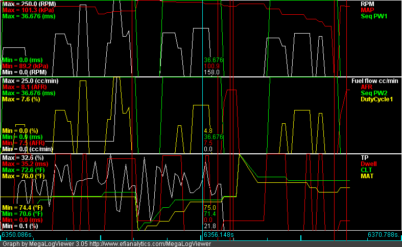 I attempted to start last night and discovered I had a low battery from leaving the key on while changing settings. It cranked but it would start to fire, vibrate and die, and then the starter would stop turning. I took a log and I will try to post it here. All of my sensors/inputs are reading correctly.