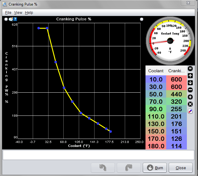 so on startup, my car was stopping cranking PW at 350RPM even though my starter is cranking around 500-550 RPM.. so obviously, shitty startup at any cold temp. hopefully this helps somebody else out, since during my forum searches I never saw anyone talking about this and it seemed like quite a few people were having similar startup issues with the miata base tunes.. maybe the base tune cranking rpm for miatas should be higher??