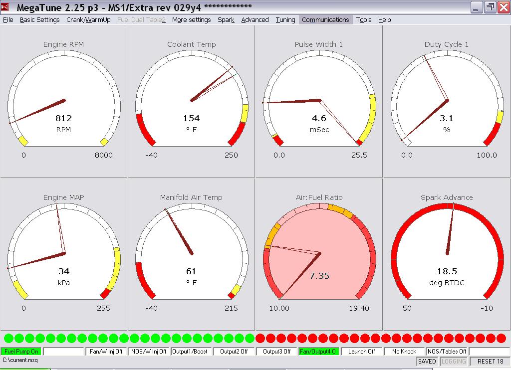 Every gauge in megatune is working (RPM, Coolant, pulse, duty cycle, MAP, Air temp, AFR and spark advance) . The AFR gauge is working and reading the same with my gauge but it always highlighted in red, i think this is because im running to rich.