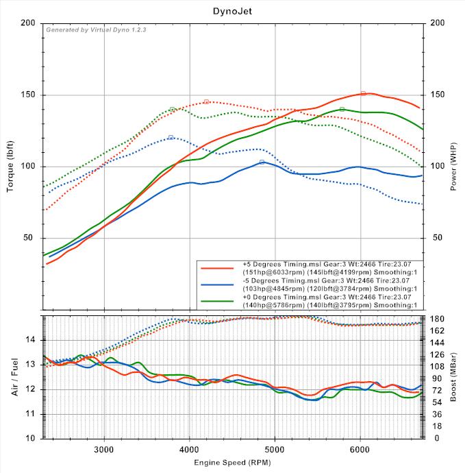 Ahhh... I forgot to mention. Notice how I seem to have lost some power in the low end at +5 degrees timing. I wonder if it is because the timing is far too advanced in that area creating torque in the wrong direction as hornetball pointed out or just an artifact.