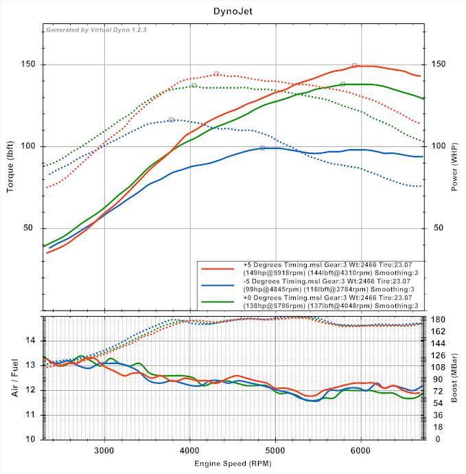 Notice how much power I lost with -5 degrees! at +5 I am still gaining power (and no knock).