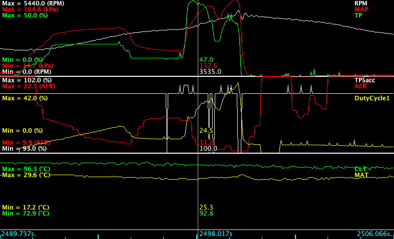 It looks like you are going WAY to rich in boost. It might just be dumping too much fuel and causing a stumble.