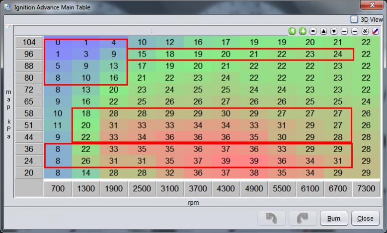 In the original map that I posted, the cells in 36+24 kpa rows were pretty much all measured, but the peak ignition advance (around 4700 rpm) was pulled back from 42 to 39 (for the reasons previously mentioned). 58-44kpa from 1900 rpm and up to redline were basically measured. 80 kpa and up from 700-1900 rpm were measured. 96 kpa up to redline was measured.