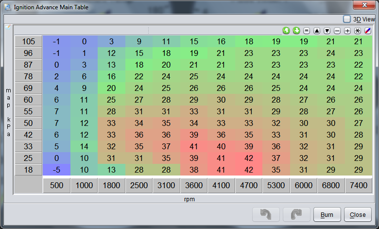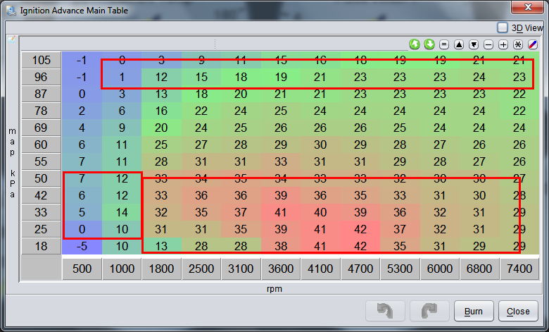 I also have a question for anyone who might know: When decelerating in gear while applying heavy brake, I can get the engine to pull more vacuum than usual, and once it gets into the lower RPMs I've noticed the OBD2 computer putting the timing into negative values. How important is it to try and replicate this? I think it can be done by merging a couple rows around 69kPa and adding another low-kPa row at the bottom to cover these values, but I don't know if this is something that I should really be concerned with or not?