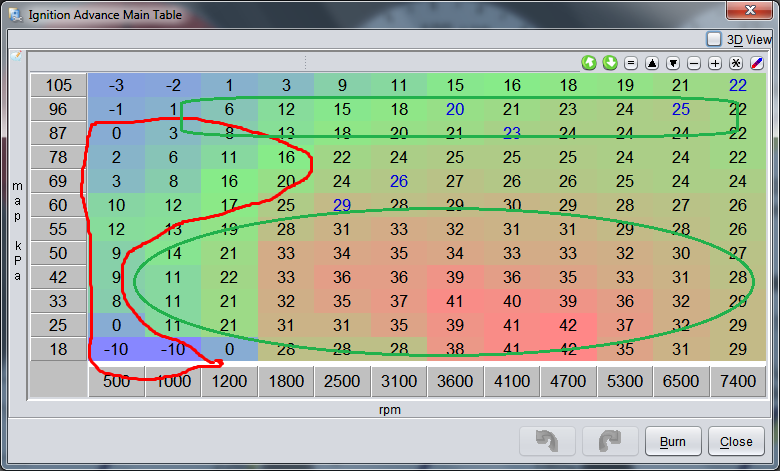 Could someone explain the -10 timing in the lower left boxes? Right now I'm running a bit higher in those boxes to help the engine catch itself if the revs fall, which makes sense to me. Why would someone want to run a negative timing here?