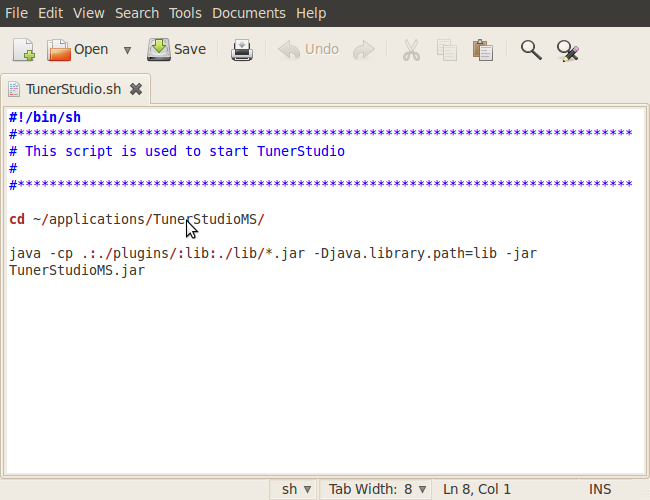 Now the FIRST thing you will need to do before making a shortcut is to display (not run) the .sh file and make sure the file directory path is correct. I believe that if you have left tunerstudio exactly where you unpacked it then it should be correct. Or if you moved it like me then you will need to edit it. Eithor way you should check to be sure.