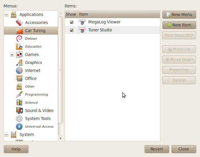 If you are like me you are going to want an applications menu selection instead. Just right click on the applications menu and click edit menus. On the left hand side you can select what category you want it in or you can just click new item on the right hand side and have it directly on the applications menu. I chose to make a new category titled "car tuning" and put them both in there. To make a new category click on applications in the upper left and click new menu on the right hand side.