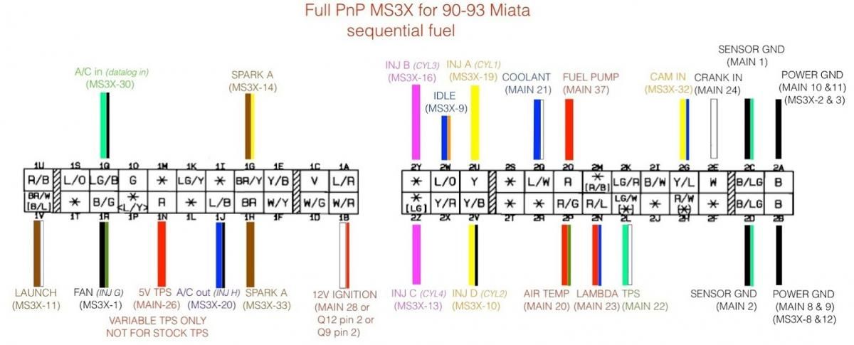 Now I re-wired my MS3 + MS3x (DIY Frank's PNP style) from my 99-00 car for the 1996 wiring (which is nearly identical to the 1990-93 wiring, apart from already being sequential injection) according to this schematic: