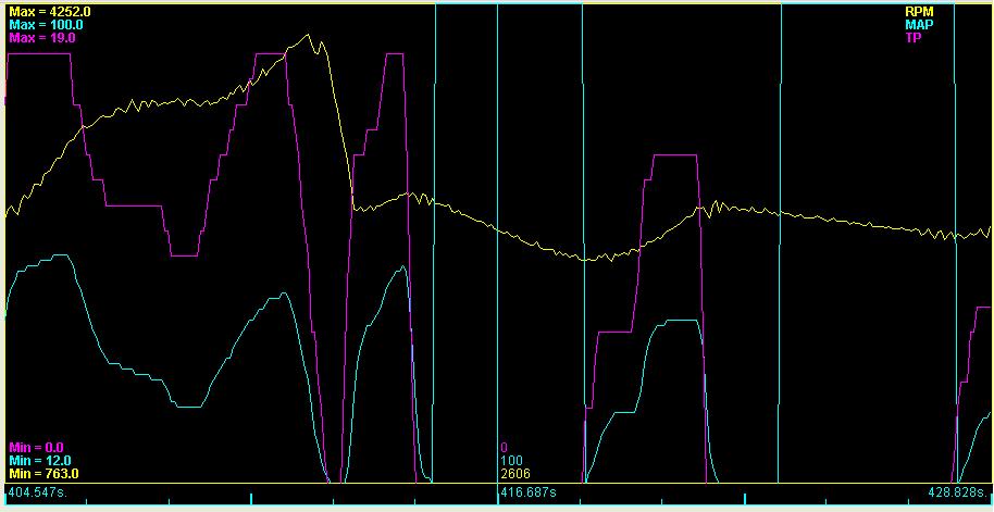 I have attached a screen shot of a datalog that shows the problem. The TP goes to zero when I lift off the throttle and the RPM starts to decrease. The MAP drops to 12kPa briefly and then shoots up to 100kPa where it stays until I touch the throttle.