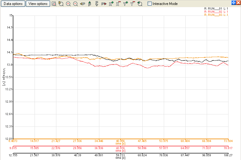 FWIW a Speed / Voltage log of a normally aspirated Miata during an autocross run. At first the car is at idle sitting at the starting line. GPS jitter shows a couple MPH but that is not the case. DL1 powered from the lighter socket.