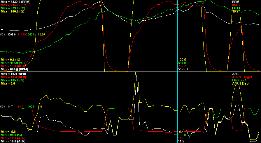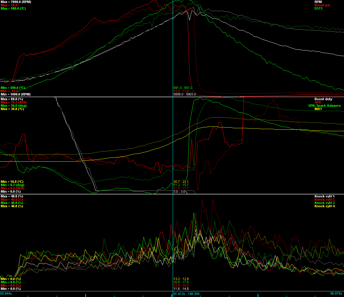 I had a search for similar issues but could not see anything looking like this. In short, my EGTs appear to climb very quickly, just a 5 second 2nd and 3rd gear pull will almost reach 900C (1650F) yet my AFRs at WOT (15-16psi) are mid 11s.
