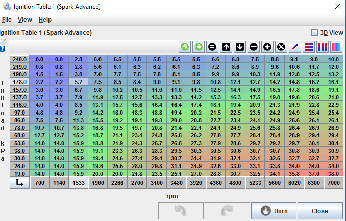 really? it's almost 10° retarded below stock timing at 100kPa, and the same in boost... thing is hitting single digit spark angle at 7psi?! i'd be running 20° there...