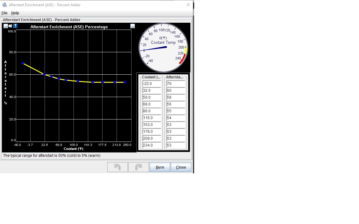 Let me add info re: my post 19. The long ASE at temp works well to let the EGO take over and keep the AFR in line. However, please ignore my cold start settings, as my cold start is really bad.
