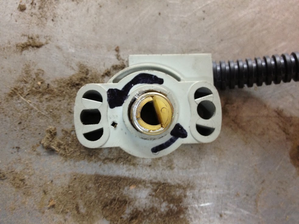 The throttle only rotates 90 degrees. Therefore, it would stand to reason that the TPS would only rotate 90 degrees as well. So it would seem to me that you need to identify the 0 degree (closed) and 90 degree (open) position on both the throttle and the TPS and align them accordingly. Then the yellow plastic piece can be inserted relative to that collective orientation and should lock the two in place.