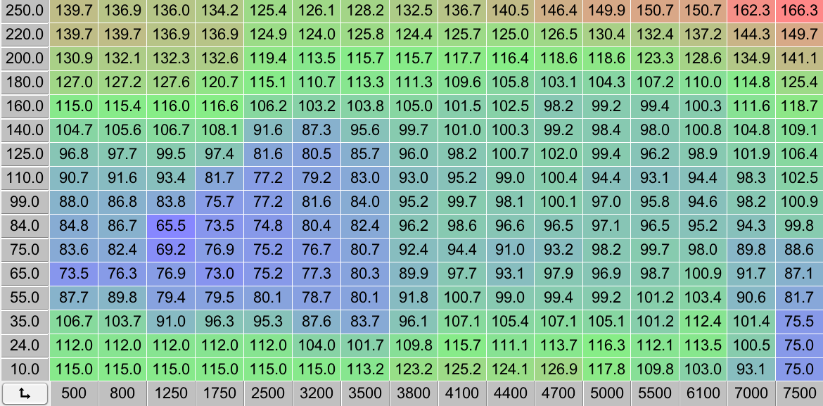 My target at 3,800rpm and 160kpa is roughly 11.5:1. It takes a VE value of 105 to reach that AFR.