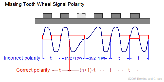 It shows the input polarity the same as mine (slope is upgoing during the missing tooth) however it incorrectly implies that rising edge of the input signal is the trigger point. The reason is that this image is from the MS-2 documentation. On the MS-1, the primary trigger goes straight into the hardware interrupt pin of the 68HC908 microprocessor, which is an active-low input. On the MS-2, this input goes to a GPIO pin of the MC9S12C64 (IOC0) which I believe is configured as a timer control (reading C makes my eyes water...) and that input does indeed appear to be active-high.