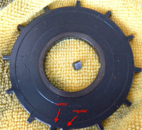 If you need to change it, just get a tiny drill and make your new hole. Easy. If you look close you can see two dot-size holes on the upper right of the top wheel. the right-most one is the stock one. Outer wheel has a "D" hole. Inner wheel is a round hole (it may have also been D and drilled out--I forget).