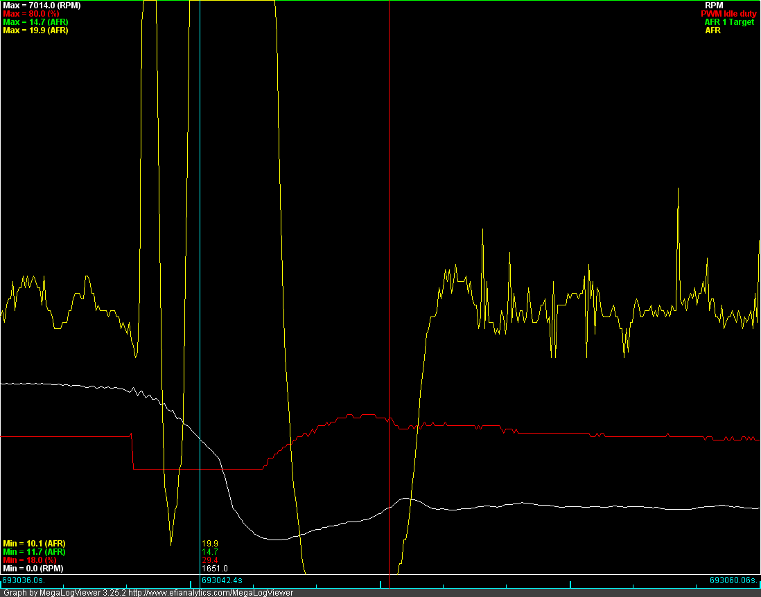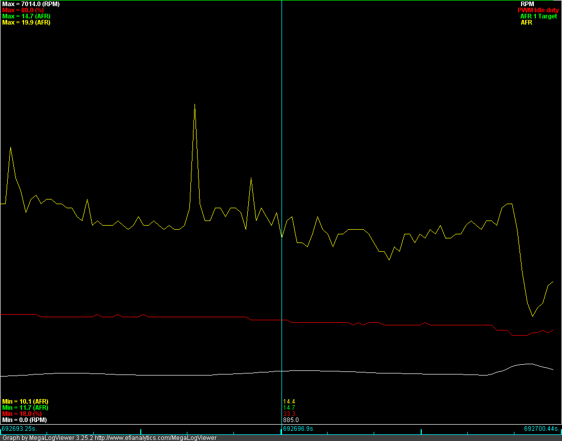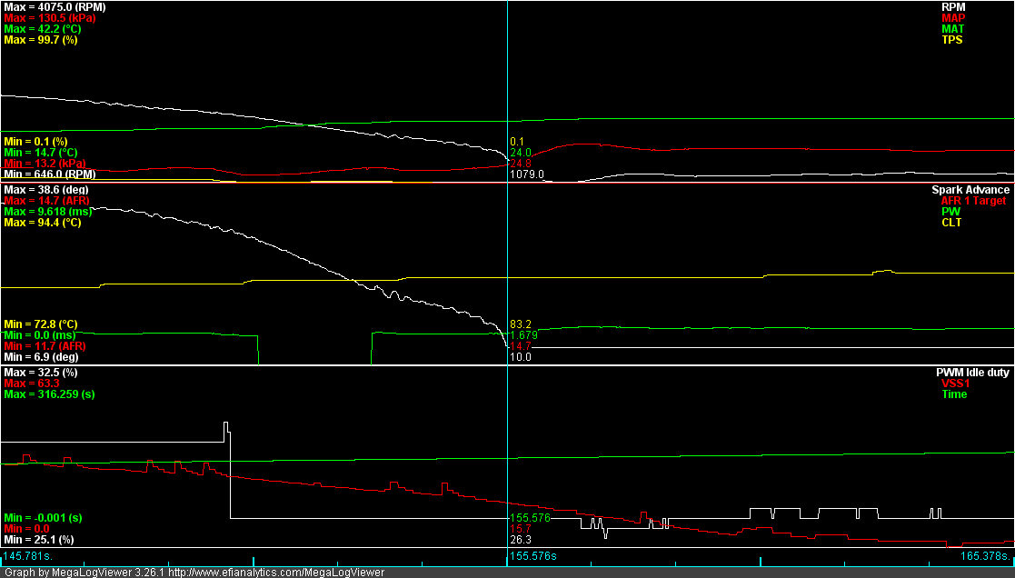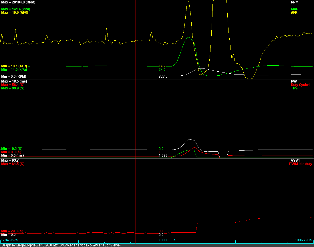 Here is my car about to enter an idle state, note that the Idle PWM duty is at 29.4, as you can see in the graph, this causes a nasty idle dip.